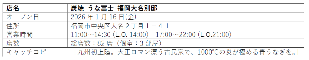 名古屋発のうなぎ専門店『炭焼 うな富士』(運営:株式会社かぶらやグループ/本社:愛知県名古屋市/代表取締役社長:榎本 渉)は、2026年1月16日(金)、福岡県福岡市中央区大名に九州エリア初出店となる新店舗『炭焼 うな富士 福岡大名別邸』をグランドオープンいたします。
