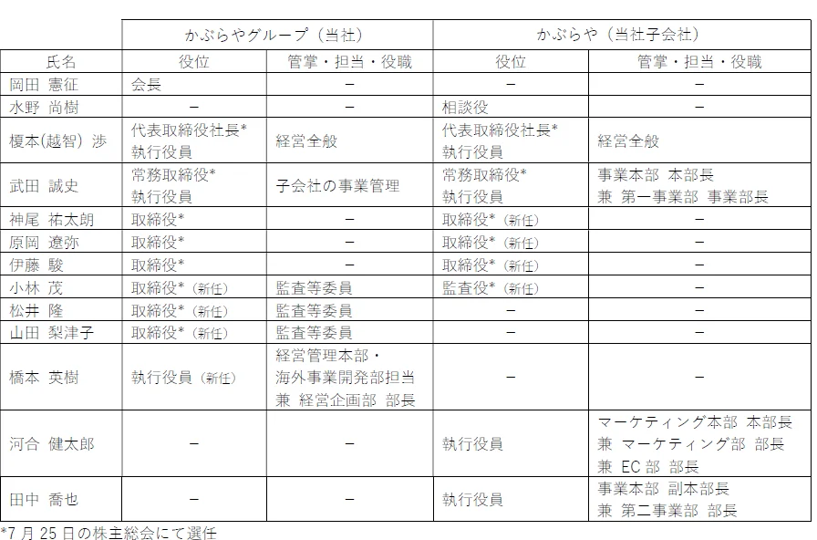 株式会社かぶらやグループ(本社:愛知県名古屋市 代表取締役社⾧:榎本 渉 以下:当社)は、当社及び当社子会社の株式会社かぶらやにおいて、2025 年8 月1 日付の経営体制の変更について、7 月25 日開催の株主総会および取締役会にて、以下の通り決定致しましたのでお知らせ致します。引き続き、持続的かつ中⾧期的な成⾧に向けた事業拡大とガバナンス強化に取り組んでまいります。