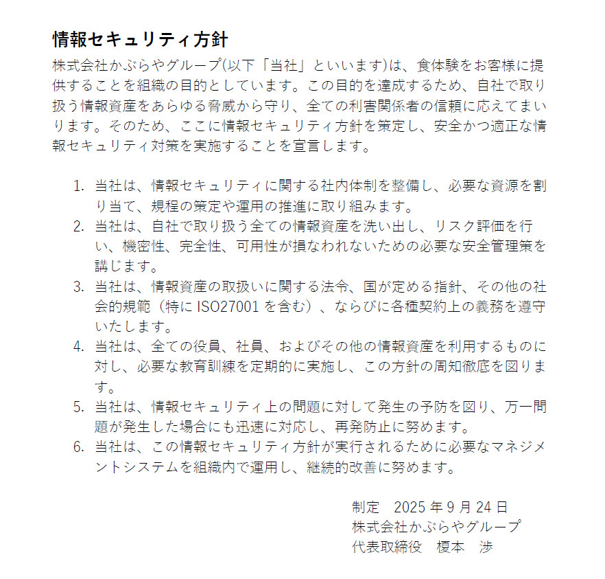 株式会社かぶらやグループでは、お客様に安心して食体験を楽しんでいただくため、情報資産の保護を重要な責務と考えています。このたび、当社の「情報セキュリティ方針」を策定し、ホームページに公開しました。