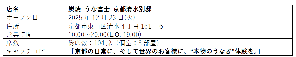 創業30周年の節目に、京都・清水寺参道の五条坂に新店舗『炭焼 うな富士 京都清水別邸』をオープンいたします。古都の趣と職人技が織りなすうなぎ料理で、唯一無二の“幸腹体験”をご提供します。