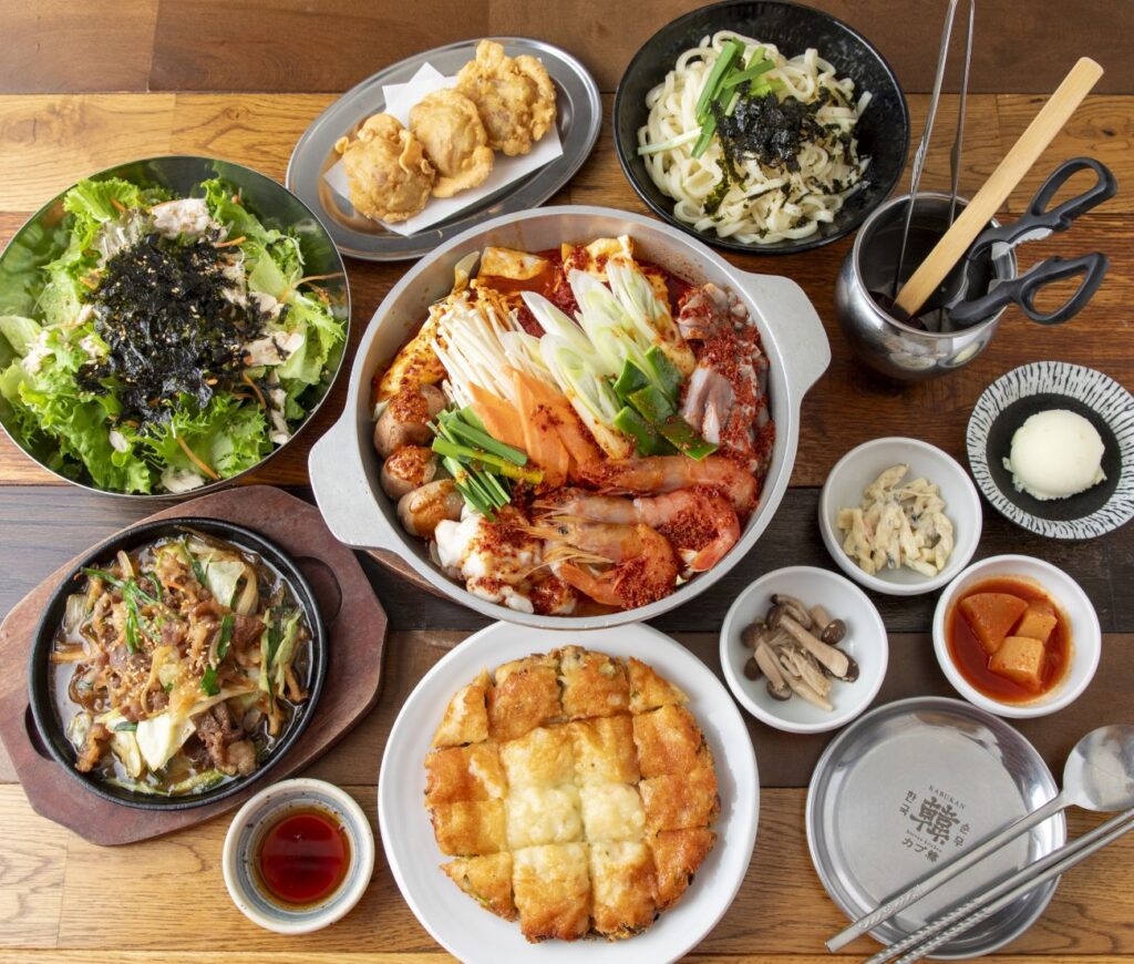保美豚(ほうびとん)の「サムギョプサル」、食べごたえ抜群「チーズタッカルビ」、海鮮鍋「ナッコプセ」など、本格韓国料理をカジュアルで広々とした店内でご堪能いただけます。テラス席もあり。