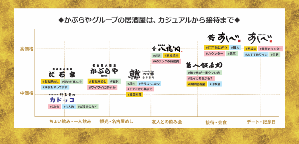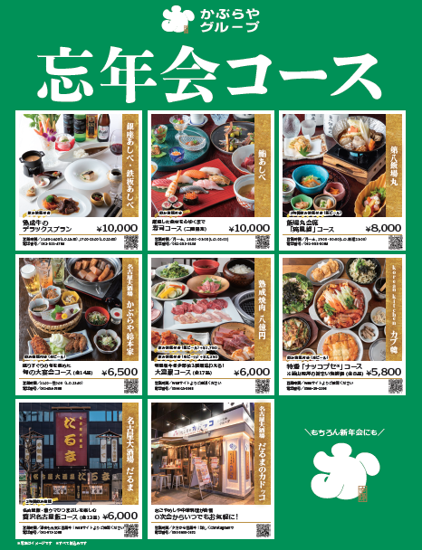 かぶらやグループは、名古屋市内6店舗と刈谷市内2店舗の計8店舗(ブランド一覧)にて、年末需要に応える各種「忘年会コース」を11月より提供開始しました。名古屋名物を中心とした居酒屋、海鮮料理、熟成肉ステーキ、韓国料理、焼肉など、多彩なラインナップを展開。多様な利用シーンに対応します。