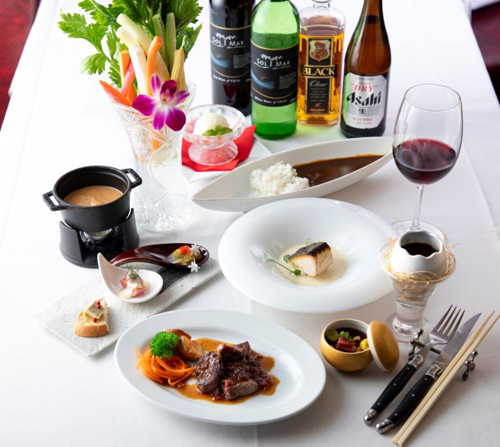『銀座あしべ・鉄板あしべ』(伏見)では、旬の食材をふんだんに使った創作料理のフルコースをご提供。柳橋市場直送の鮮魚や、定番人気の『旬菜のスティックサラダ 和風バーニャカウダソース』、さらに熟成黒毛和牛のステーキなど、年末にふさわしい豪華なメニューを組んでいます。お酒は瓶ビールやワイン、ハイボール、カクテルなどお料理に合う16種類を用意。会食や大切な方との食事にも適しています。
